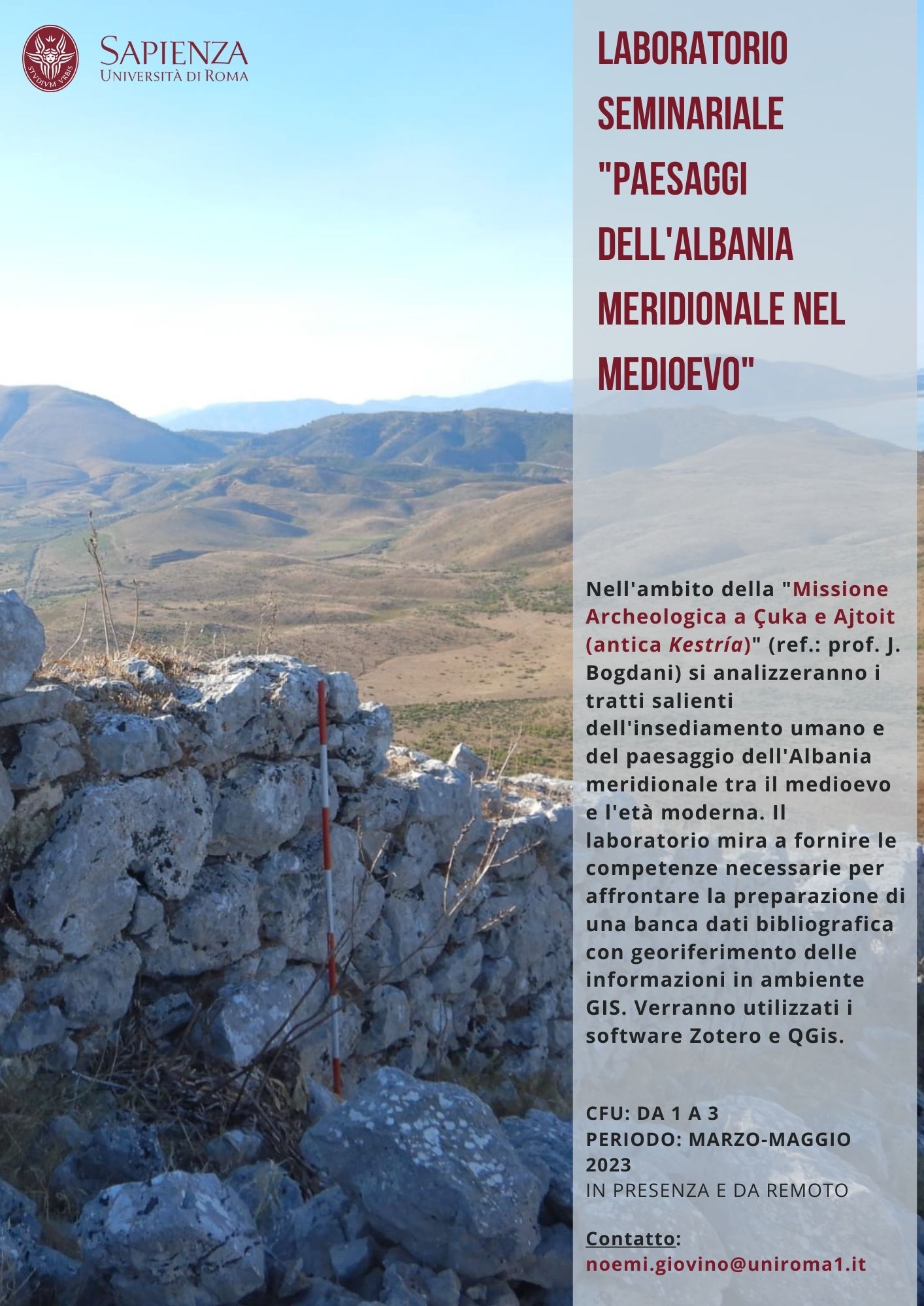 Nell’ambito del Laboratorio di paesaggi dell’Albania meridionale e della Missione Archeologica a Çuka e Ajtoit (antica Kestría) diretta da Julian Bogdani, verranno analizzati i tratti salienti dell’insediamento umano e del paesaggio dell’Albania meridionale dal medioevo all’età moderna. L’obiettivo principale del laboratorio è quello di fornire le competenze necessarie per la preparazione di una banca dati bibliografica georiferita, utilizzando gli strumenti informatici Zotero e QGIS. In questo modo, sarà possibile una gestione efficiente e accurata delle informazioni raccolte e una migliore comprensione del territorio e delle comunità umane che lo hanno abitato nel corso dei secoli.