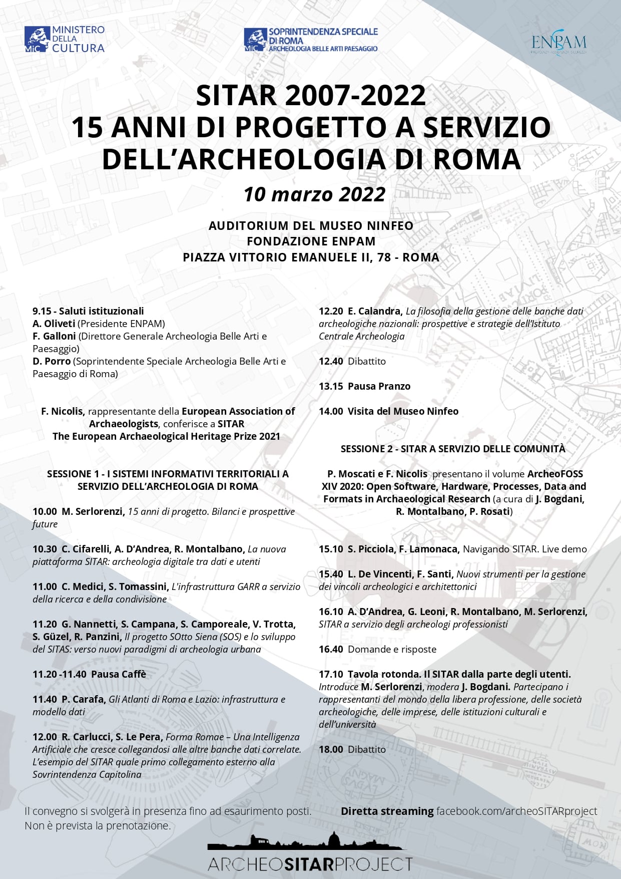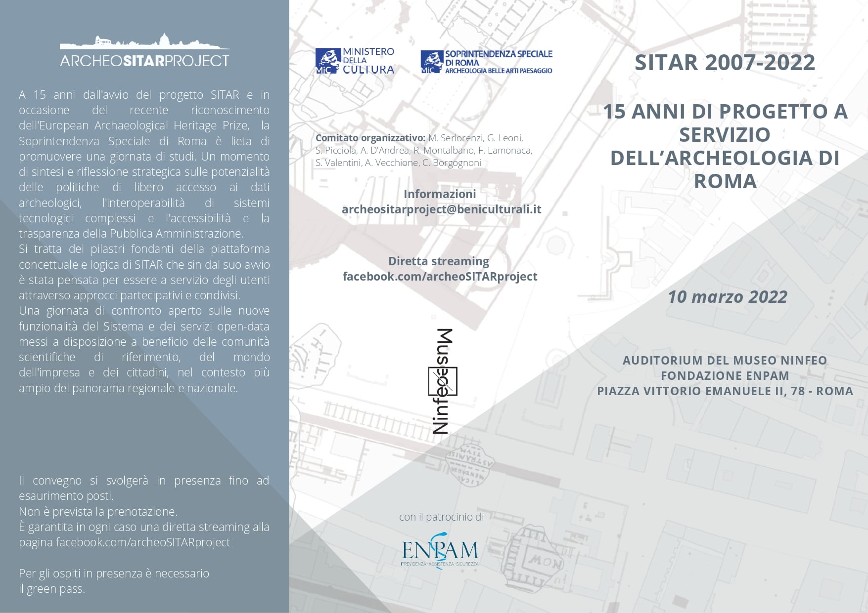 A 15 anni dall'avvio del progetto SITAR e in occasione del recente riconoscimento dell'European Archaeological Heritage Prize, la Soprintendenza Speciale Roma è lieta di promuovere una giornata di studi. Sarà un momento di sintesi e riflessione sulle potenzialità delle politiche di libero accesso ai dati archeologici, l'interoperabilità di sistemi tecnologici complessi e l'accessibilità e la trasparenza della Pubblica Amministrazione.